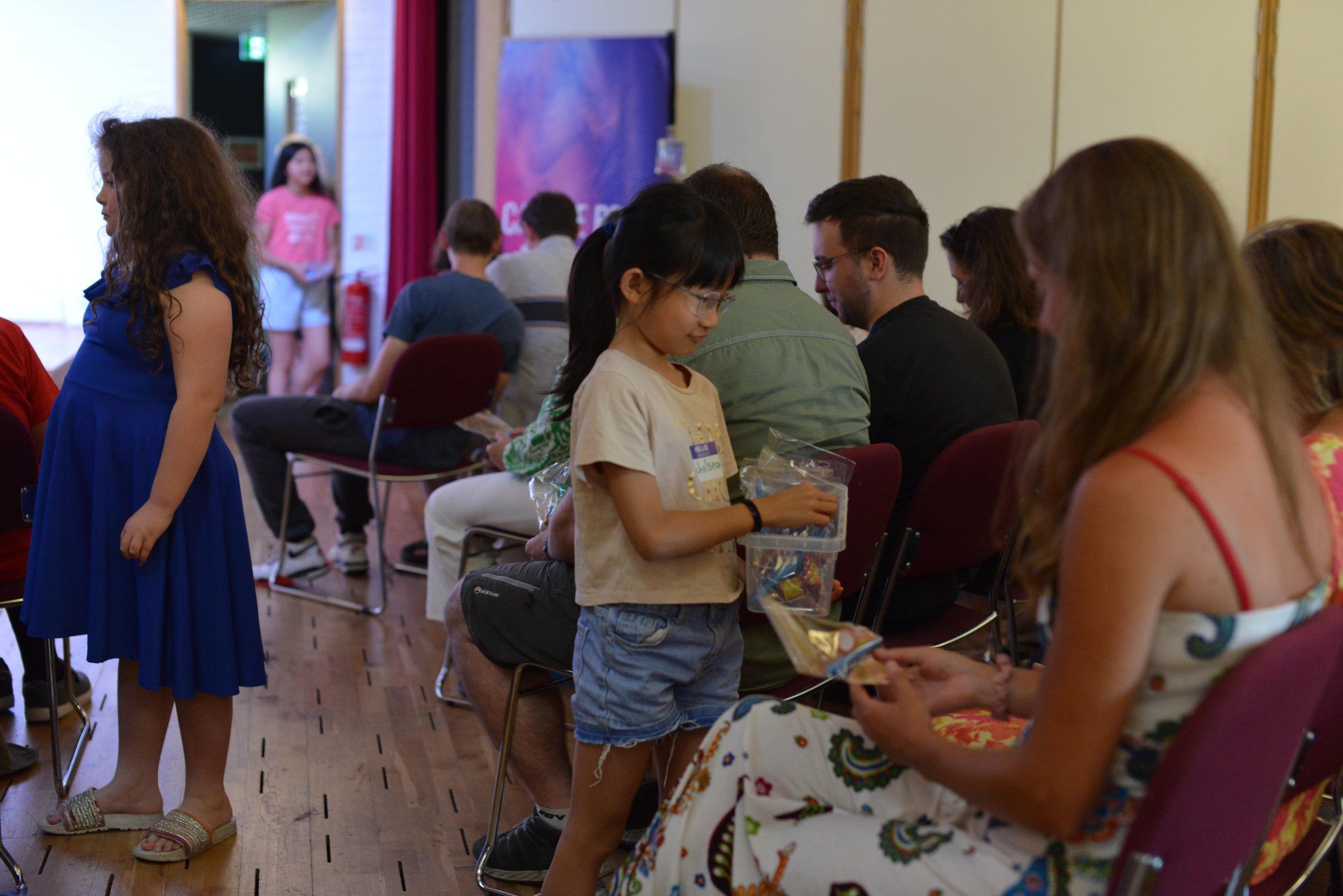 Everyone starts together in the main service in the auditorium. Then, shortly after the start, children and young people are prayed for and invited to their sessions in the cabins next door (named Eden and Bethel).